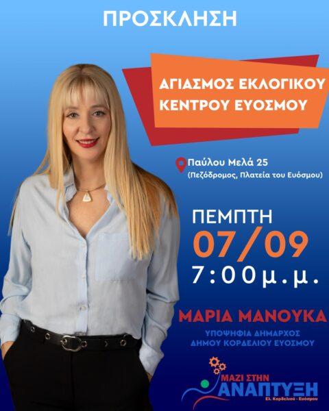 Την Πέμπτη 7 Σεπτεμβρίου στις 19:00 η υποψήφια δήμαρχος του Δήμου Κορδελιού – Ευόσμου και επικεφαλής της παράταξης «Μαζί στην Ανάπτυξη του Ελ. Κορδελιού – Ευόσμου», Μαρία Μανούκα απευθύνει ανοιχτό κάλεσμα σε όλες και όλους για τον αγιασμό του εκλογικού κέντρου στον Εύοσμο.