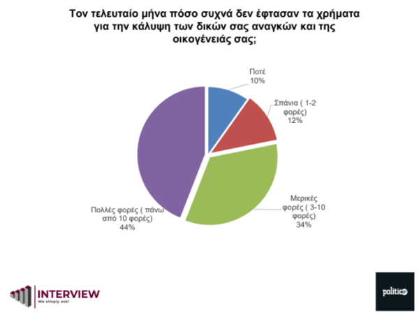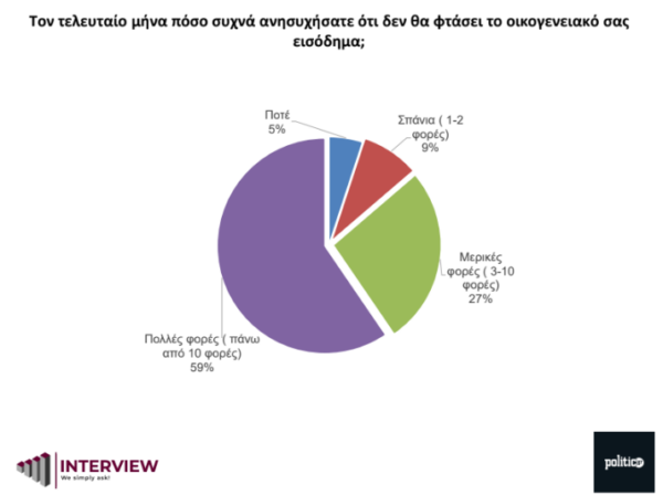 Συγκεκριμένα, έξι στους δέκα λένε ότι μετά τις 20 του μηνός ανησυχούν ότι δε θα φτάσει το οικογενειακό τους εισόδημα για να καλύψουν τις βασικές τους ανάγκες.