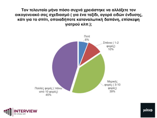 Σημαντική επίπτωση της συνεχιζόμενης ακρίβειας αφορά στη μείωση της αγοραστικής δύναμης των νοικοκυριών. Οκτώ στα δέκα νοικοκυριά χρειάστηκε να αλλάξει τον τελευταίο μήνα τον οικογενειακό του σχεδιασμό και ανέβαλε κάποια καταναλωτική δαπάνη που είχε προγραμματίσει, ακόμη και ιατρική επίσκεψη.