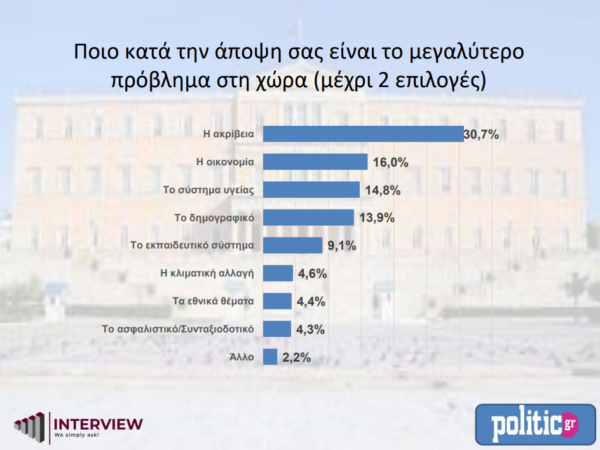 Σε αντιδιαστολή με τη δήλωση του πρωθυπουργού για «βελτιωμένη και ανθεκτική οικονομία» οι πολίτες την κατατάσσουν στη δεύτερη θέση των προβλημάτων της χώρας με ποσοστό 16%. Στην πρώτη θέση με σχεδόν διπλάσιο ποσοστό 30,7% είναι η ακρίβεια, ενώ το σύστημα υγείας είναι τρίτο με 14,8%.