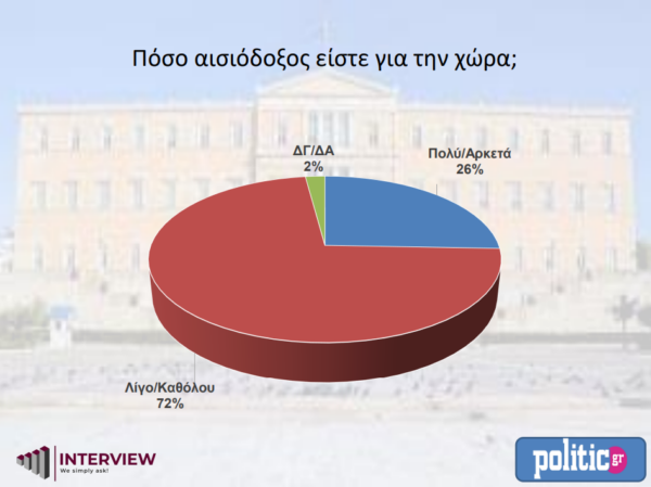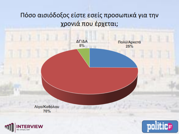 Οδεύοντας προς την «καρδιά» του χειμώνα, οι οικονομικές υποχρεώσεις δημιουργούν στους πολίτες ένα μεγάλο αίσθημα απαισιοδοξίας για τη χρονιά που έρχεται όσον αφορά τους ίδιους. Το 70% δηλώνει πως είναι λίγο ή καθόλου αισιόδοξο, ενώ μόλις το 25% φαίνεται πολύ ή αρκετά αισιόδοξο. Το 5% απάντησε ΔΓ/ΔΑ.