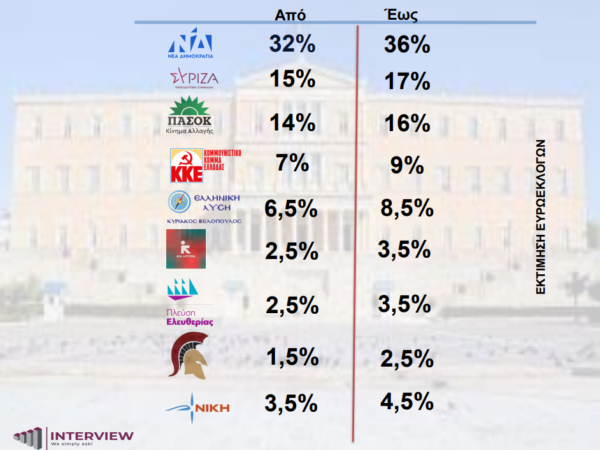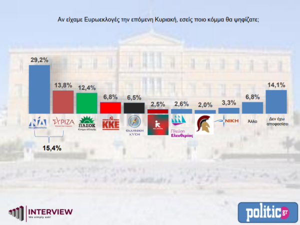 Με τις ευρωεκλογές του 2024 να αποτελούν τον επόμενο μεγάλο πολιτικό σταθμό, η δημοσκόπηση της Interview που διενεργήθηκε για λογαριασμό της POLITIC δείχνει άνοιγμα της ψαλίδας υπέρ της Νέας Δημοκρατίας σε σύγκριση με τις εκλογές της 26ης Μαΐου 2019.