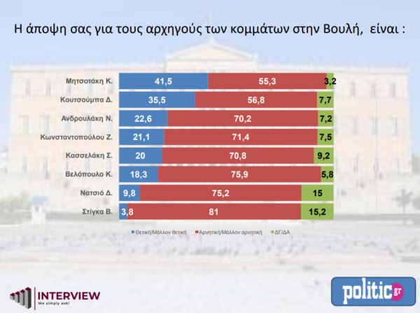Όσον αφορά τη δημοφιλία, παρόλο που οι περισσότεροι ερωτηθέντες απάντησαν πως έχουν αρνητική άποψη για τον Κυριάκο Μητσοτάκη (σ.σ. 55,3%), ο πρωθυπουργός εξακολουθεί να υπερτερεί έναντι των πολιτικών του αντιπάλων.