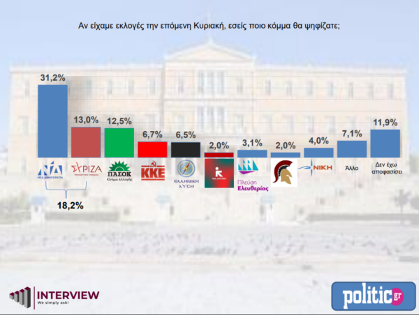 Στην πρόθεση ψήφου η διαφορά ΝΔ – ΣΥΡΙΖΑ εντοπίζεται στις 18,2 μονάδες. Η Νέα Δημοκρατία βρίσκεται στο 31,2%, και ο ΣΥΡΙΖΑ ακολουθεί με 13% (Στις εθνικές εκλογές του Ιουνίου η ΝΔ κατέγραψε ποσοστό 40,5 και ο ΣΥΡΙΖΑ 17,8%). Ο ΣΥΡΙΖΑ φαίνεται να επιστρέφει στη δεύτερη θέση μετά από διαρκή δημοσκοπική κάμψη που τον έριχνε στην τρίτη θέση, απειλώντας τον τίτλο του, αυτόν της αξιωματικής αντιπολίτευσης.