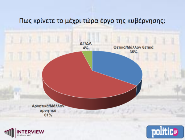 Το 61% κρίνει «αρνητικά» το μέχρι τώρα έργο της κυβέρνησης σε αντίθεση με το 35% που απάντησε «θετικά».