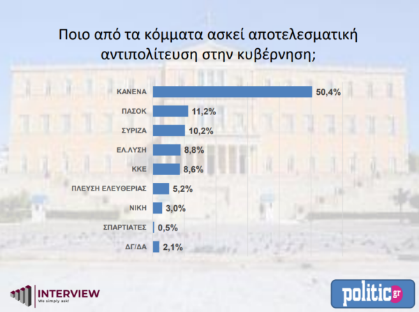 Στον αντίποδα, ιδιαίτερο ενδιαφέρον παρουσιάζει και η καρτέλα που δείχνει πως κανένα από τα κόμματα της αντιπολίτευσης δεν καταφέρνει να πείσει πως αποτελεί εναλλακτική πρόταση εξουσίας. Ένας στους δύο απαντά πως κανένα από τα κόμματα δεν ασκεί αποτελεσματική αντιπολίτευση. Μάλιστα αξιοσημείωτο είναι το γεγονός ότι το ΠΑΣΟΚ, αν και τρίτο κόμμα στην πρόθεση ψήφου, φαίνεται να είναι πιο ικανό σε σχέση με τον ΣΥΡΙΖΑ στην άσκηση αποτελεσματικής αντιπολίτευσης. Τα ποσοστά των ΣΥΡΙΖΑ, Ελληνική Λύση και ΚΚΕ είναι πολύ κοντά.