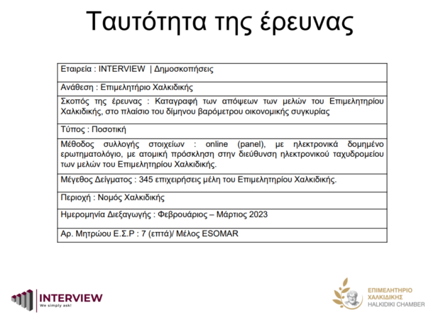Την έρευνα διεξήγαγε η εταιρεία Interview, κατά τους μήνες Φεβρουάριο-Μάρτιο 2023. Το δείγμα αποτελείται από 345 επιχειρήσεις διαφόρων μεγεθών, μέλη του Επιμελητηρίου Χαλκιδικής, η συμμετοχή των οποίων στην έρευνα είναι προαιρετική.