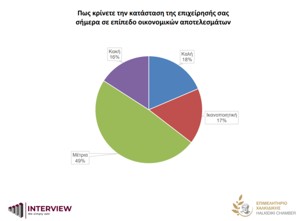 18% καλή, 17% ικανοποιητική, 49% μέτρια και 16% κακή, εκτιμούν οι επιχειρηματίες της Χαλκιδικής την κατάσταση των επιχειρήσεων τους. Ωστόσο κι εδώ διαφαίνεται κάποια αισιοδοξία αφού υπάρχει πλήρης αναστροφή του κλίματος σε σχέση με το προηγούμενο κύμα.