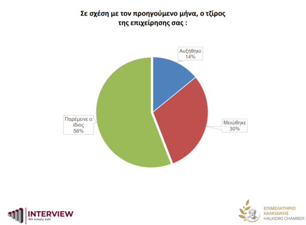 Το 56% δηλώνει ότι ο τζίρος της επιχείρησής τους παρέμεινε ο ίδιος, 14% ότι αυξήθηκε ενώ το 30% δηλώνει ότι μειώθηκε.