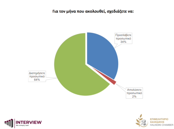 Εν όψει της έναρξης της νέας σεζόν, 64% των επιχειρήσεων δηλώνει ότι θα διατηρήσει το προσωπικό του για το μήνα που ακολουθεί, 34% θα προσλάβει νέο και μόλις 2% θα προβεί σε απολύσεις.