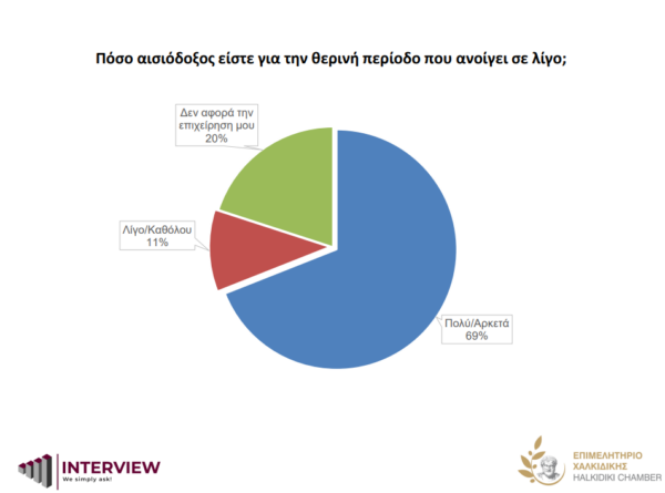 Πολύ/αρκετά αισιόδοξο δηλώνει το 69% των επιχειρηματιών της Χαλκιδικής για την καλοκαιρινή σεζόν που ξεκινά σε λίγο, 11% δηλώνει λίγο/καθόλου και 20% ότι δεν το αφορά.