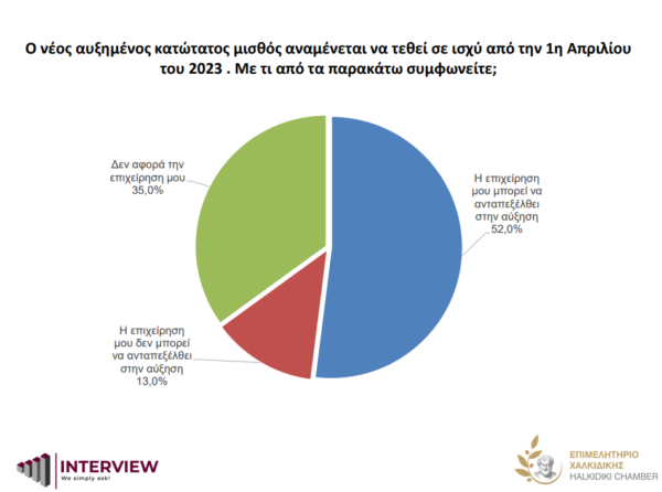 52% του δείγματος δηλώνει ότι η επιχείρησή του μπορεί να ανταπεξέλθει στο νέο αυξημένο κατώτατο μισθό, που θα τεθεί σε ισχύ από την 1η Απριλίου 2023. 13% δηλώνει ότι δεν μπορεί να ανταπεξέλθει ενώ το 30% αναφέρει ότι δεν το αφορά.