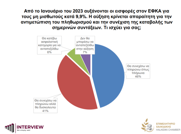 Η αύξηση 9,9%, που έχει επιβληθεί στις εισφορές των μη μισθωτών ΕΦΚΑ, ως μέτρο αντιμετώπισης του πληθωρισμού προκειμένου να συνεχίσει κανονικά η καταβολή των συντάξεων, δείχνει ότι δεν θα επηρεάσει την εισπραξιμότητα, καθώς το 46% δηλώνει ότι θα συνεχίσει να πληρώνει κανονικά, 41% θα συνεχίσει να πληρώνει παρότι θα δυσκολευτεί, 6% θα αλλάξει ασφαλιστική κατηγορία για να μπορέσει να ανταποκριθεί, ενώ μόλις 7% δηλώνει ότι δεν θα μπορέσει να ανταποκριθεί.