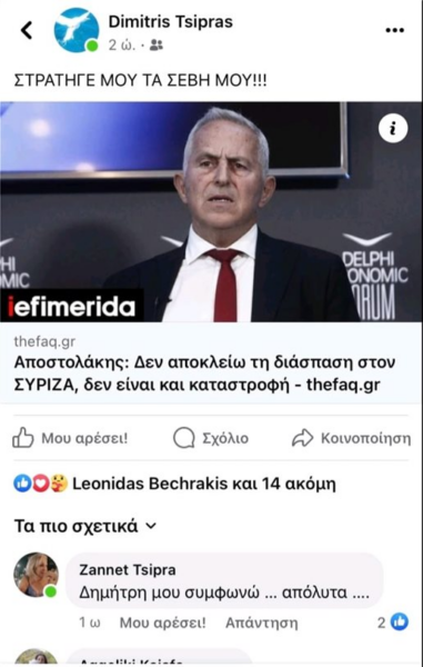 Κάτω από την ανάρτηση μάλιστα σχολίασε και η αδερφή του Αλέξη Τσίπρα Ζανέτ, η οποία έγραψε «Δημήτρη μου συμφωνώ απόλυτα».