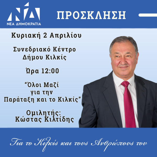 Η πολιτική εκδήλωση του κ. Κώστα Κιλτίδη θα λάβει χώρα την Κυριακή 2 Απριλίου, στις 12.00 στο Συνεδριακό Κέντρο στο Κιλκίς