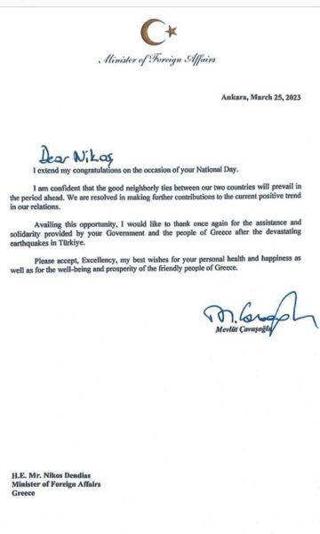 Από νωρίς χθες το πρωί έγινε γνωστό ότι ο υπουργός Εξωτερικών Μεβλούτ Τσαβούσογλου απέστειλε ευχετήρια επιστολή στον ομόλογό του Νίκο Δένδια, στην οποία, εκτός από τις ευχές για την 25η Μαρτίου, ο επικεφαλής της τουρκικής διπλωματίας ανέφερε πως είναι βέβαιος ότι οι σχέσεις καλής γειτονίας οι οποίες υφίστανται αυτή τη στιγμή μεταξύ Ελλάδος και Τουρκίας θα παγιωθούν στο μέλλον.
