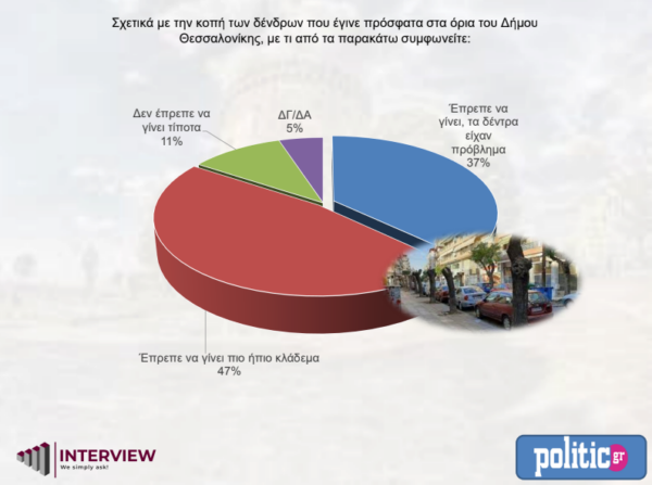 Πιο μετριοπαθείς είναι οι απαντήσεις σχετικά με το θέμα που προκάλεσε πολλές αντιδράσεις, της κοπής των δέντρων στα όρια του δήμου Θεσσαλονίκης, με το 47% να θεωρεί ότι έπρεπε να γίνει πιο ήπιο κλάδεμα, και το 37% να συμφωνεί με την κοπή καθώς τα δέντρα είχαν πρόβλημα. Αντίθετα μόλις το 11% πιστεύει ότι δεν έπρεπε να γίνει κλάδεμα.