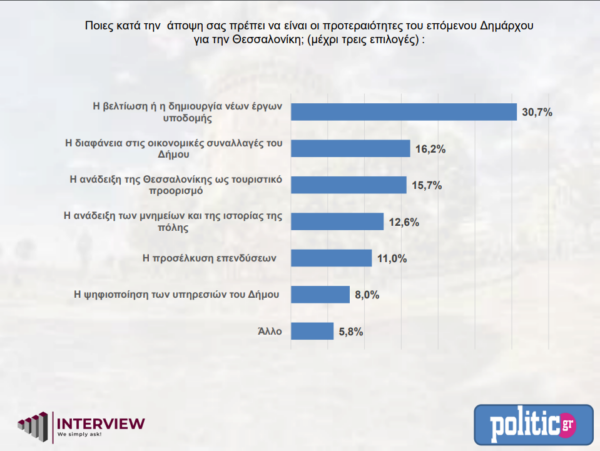 Αξιοσημείωτο είναι ότι ως δεύτερη προτεραιότητα για τον επόμενο δήμαρχο καταγράφεται η διαφάνεια στις οικονομικές συναλλαγές του δήμου (16,2%). Στην τρίτη θέση είναι η ανάδειξη της Θεσσαλονίκης ως τουριστικός προορισμός (15,7%), ενώ ακολουθούν η ανάδειξη των μνημείων και της ιστορίας της πόλης με 12,6%, η προσέλκυση επενδύσεων με 11%, και η ψηφιοποίηση των υπηρεσιών του δήμου με 8% .