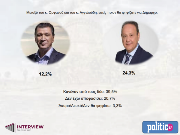 Διψήφια είναι η διαφορά μεταξύ του Στέλιου Αγγελούδη και του Γιώργου Ορφανού. Στη σχετική ερώτηση, ο Στέλιος Αγγελούδης έλαβε το 24,3% των ψήφων (από 19,7%) ενώ ο Γιώργος Ορφανός το 12,2%. Το 39,5% απάντησε «κανέναν απ’ τους δύο».