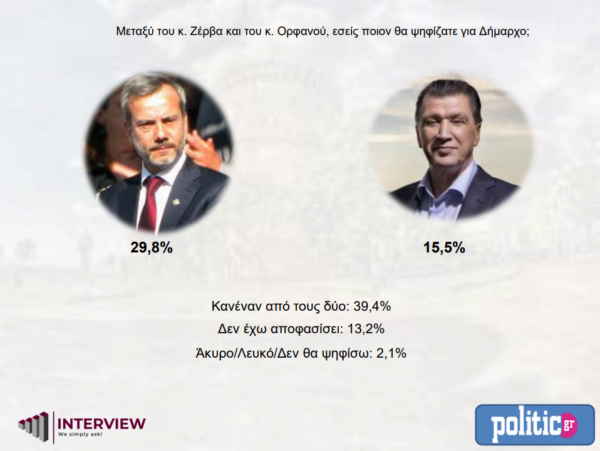 Πολύ πιο ξεκάθαρο είναι το προβάδισμα του δημάρχου έναντι του Γιώργου Ορφανού, με το 29,8% των ερωτηθέντων να απαντά «Κωνσταντίνο Ζέρβα» (από 29,3%) ενώ το 15,5% θα ψήφιζε το Γιώργο Ορφανό (από 13,7%). «Κανέναν απ’ τους δύο» είπε το 39,4% (από 41%).