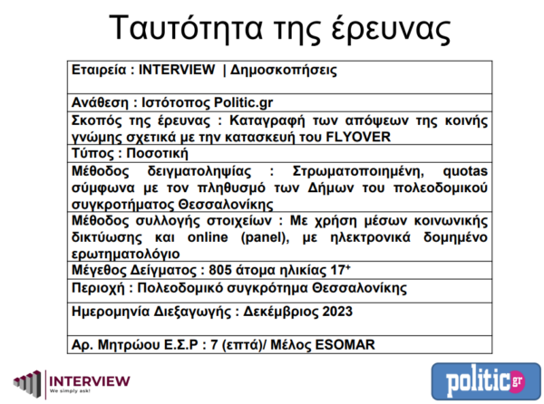Ένα μήνα μετά την έναρξη εργασιών του υπερσύγχρονου εναέριου αυτοκινητόδρομου (Flyover) η POLITIC σε συνεργασία με την Interview Δημοσκοπήσεις, διεξήγαγε την πρώτη δημοσκόπηση που καταγράφει πώς οι εργασίες έχουν επηρεάσει την καθημερινότητα των Θεσσαλονικέων.