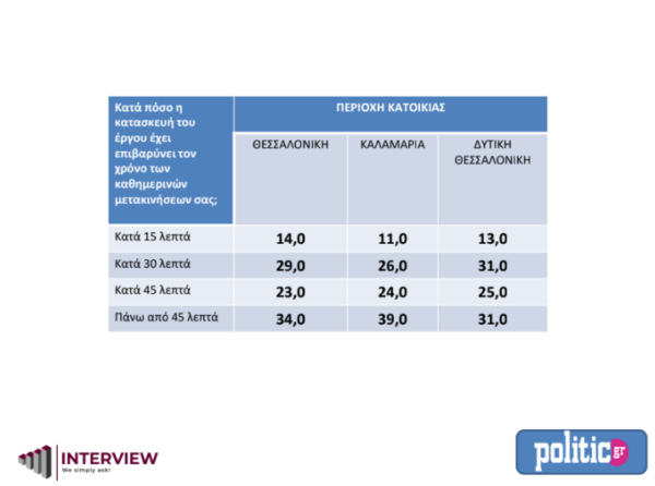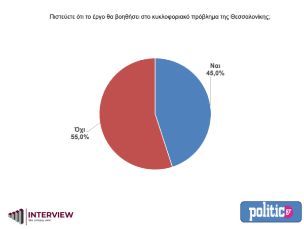 Ωστόσο, η έρευνα δείχνει ότι οι Θεσσαλονικείς δε συμπλέουν με την παραπάνω πρόταση καθώς το 55% λέει πως το έργο δε θα βοηθήσει στο κυκλοφοριακό πρόβλημα της πόλης, σε αντίθεση με το 45%.