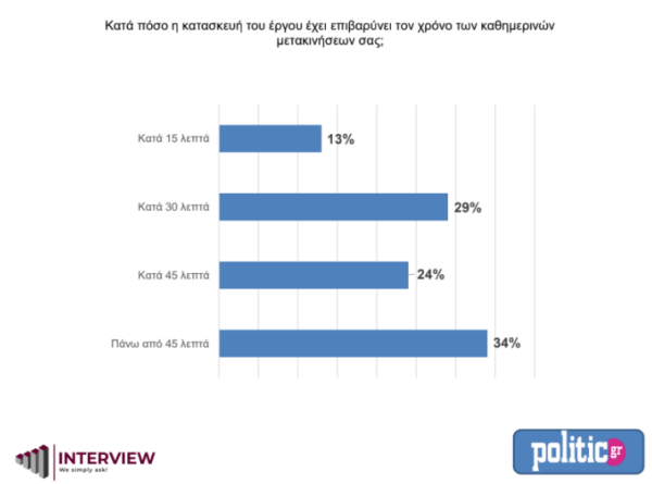 Πέρα όμως από τον επιπλέον χρόνο που καλούνται να επενδύσουν οι κάτοικοι για τις μετακινήσεις τους, η συντριπτική πλειοψηφία καλείται να αντιμετωπίσουν και το πρόβλημα της έλλειψης θέσεων στάθμευσης καθώς το 82% απαντά πως η κατασκευή του αυτοκινητόδρομου έχει καταστήσει πιο έντονο το πρόβλημα.