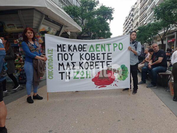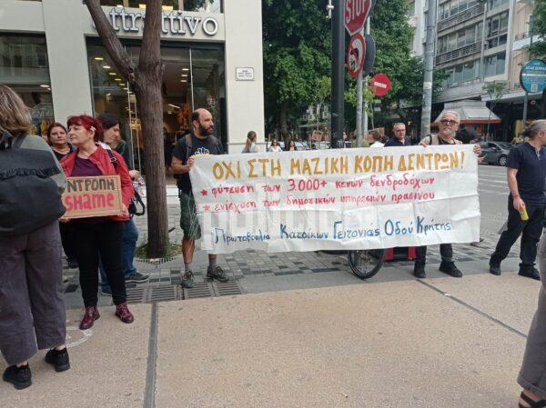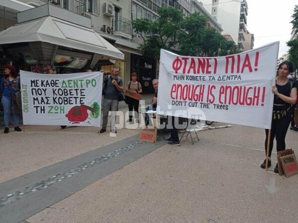 “Με κάθε δέντρο που κόβετε μας κόβετε την ζωή” και “Φτάνει πια μην κόβετε τα δέντρα”, αναγράφεται στα πανό.