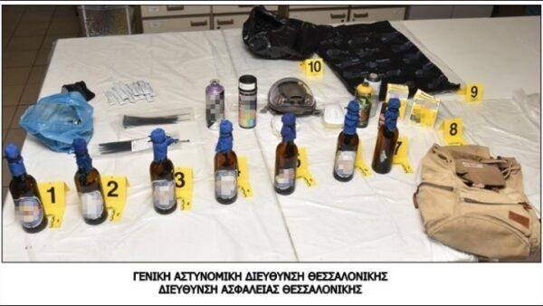 Στην κατοχή της νεαρής γυναίκας (ημεδαπή) βρέθηκαν επίσης (και κατασχέθηκαν) ένα σπρέι πιπεριού, μία αντιασφυξιογόνα μάσκα με δύο φίλτρα, πλήθος πλαστικών δεματικών (tie wrap), τέσσερα σπρέι διαφορετικών χρωμάτων, συσκευασίες φαρμακευτικής πόσιμης γέλης για προστασία από δακρυγόνα και σωρεία εντύπων και χειρόγραφων σημειώσεων.