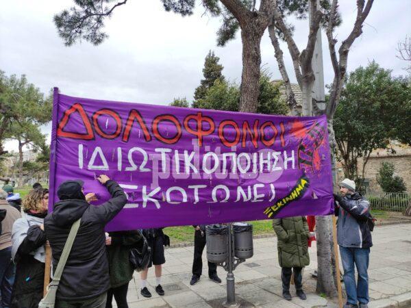 Με πανό και συνθήματα, οι διαδηλωτές εκφράζουν την αντίθεσή τους στην πολιτική των ιδιωτικοποιήσεων, ζητώντας να σταματήσουν εδώ και τώρα οι αποκρατικοποιήσεις.