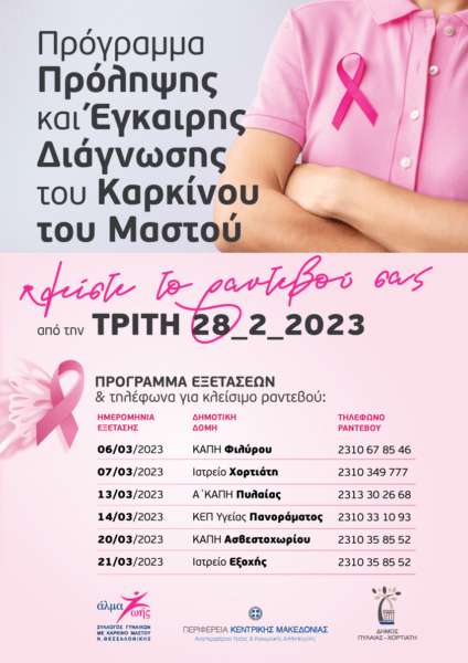 ΔΡΑΣΕΙΣ ΠΡΟΛΗΨΗΣ και ενημέρωσης του γυναικείου πληθυσμού για τον καρκίνο του μαστού συνδιοργανώνει για τον μήνα Μάρτιο ο Δήμος Πυλαίας Χορτιάτη σε συνεργασία με τον Σύλλογο Γυναικών με Καρκίνο του Μαστού “Άλμα Ζωής” Νομού Θεσσαλονίκης και με την Αντιπεριφέρεια Υγείας και Κοινωνικής Αλληλεγγύης της Περιφέρειας Κεντρικής Μακεδονίας.
