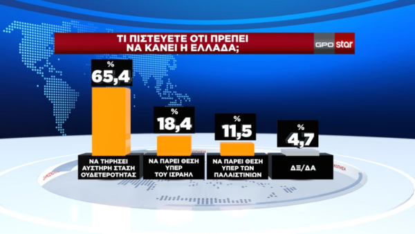 Σε σχέση με την στάση που πρέπει να τηρήσει η χώρα μας, το 65,4% προτιμά μια αυστηρή στάση ουδετερότητας, το 18,4% προτιμά να πάρει θέση υπέρ του Ισραήλ και το 11,5% να πάρει θέση υπέρ των Παλαιστινίων.