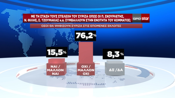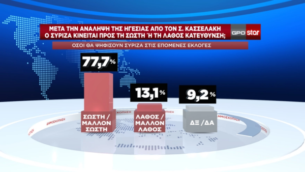 Μεταξύ όσων δηλώνουν ότι θα ψηφίσουν ΣΥΡΙΖΑ στις επόμενες εκλογές το 76,2% θεωρεί ότι η στάση των κ.κ. Φίλη, Σκουρλέτη και Τζουμάκα δεν συμβάλει στην ενότητα του κόμματος και το 77,7% θεωρεί ότι ο ΣΥΡΙΖΑ μετά την ανάληψη της ηγεσίας από τον κ. Κασσελάκη κινείται στη σωστή και μάλλον στη σωστή κατεύθυνση.