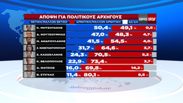 Δημοφιλέστερος πολίτικος αρχηγός είναι ο Κ.Μητσοτάκης. Ακολουθεί δεύτερος ο Δ.Κουτσούμπας, τρίτος ο Ν. Ανδρουλάκης, τέταρτη η Ζ. Κωνσταντοπούλου και τέταρτος ο Στ. Κασσελάκης.