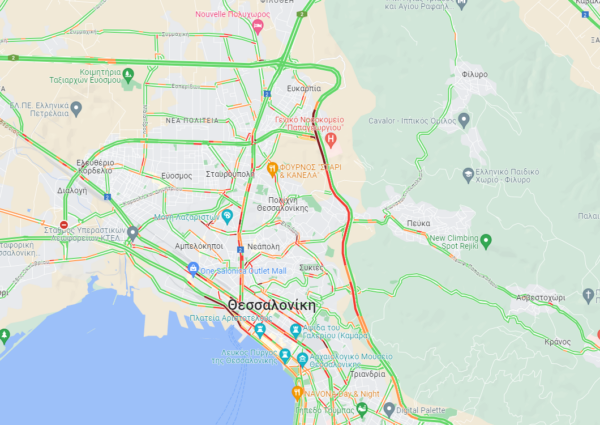 Επίσης και κεντρικές αρτηρίες είναι στο κόκκινο από την σημερινή κίνηση, με ιδιαίτερο φόρτο να εντοπίζουμε στην Εγνατία, στην Λαγκαδά, Λεωφόρο Νίκης, Καρατάσου και Σταθμού.