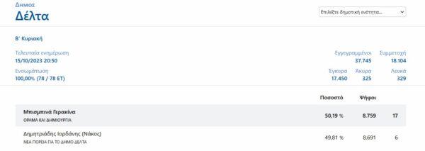 Ειδικότερα, η μάχη μεταξύ των δύο υποψηφίων της Γερακίνας Μπισμπινά και του Ιορδάνη Δημητριάδη εξελίχθηκε σε ντέρμπι καθώς με ενσωματωμένο το 100% εκλέγεται νέα δήμαρχος η κ. Μπισμπινά λαμβάνοντας το 50,19% ενώ ο κ. Δημητριάδης το 49,01%.