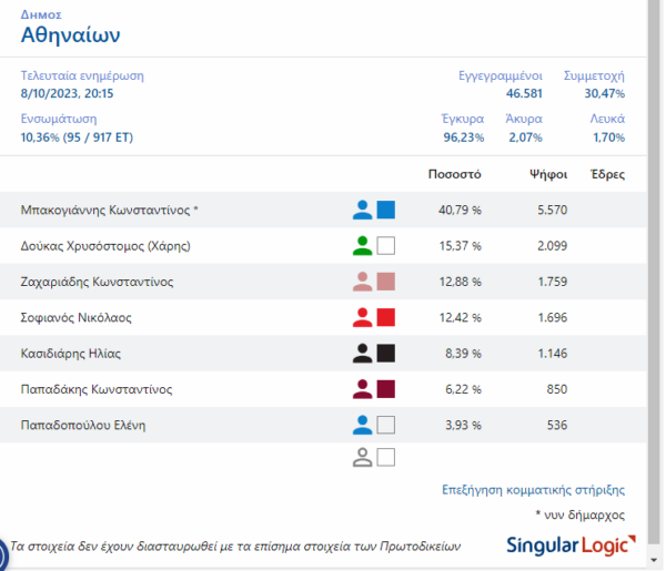 Δείτε τα μέχρι στιγμής αποτελέσματα σύμφωνα με την Singular Logic που κάνει την καταμέτρηση για το υπουργείο Εσωτερικών: