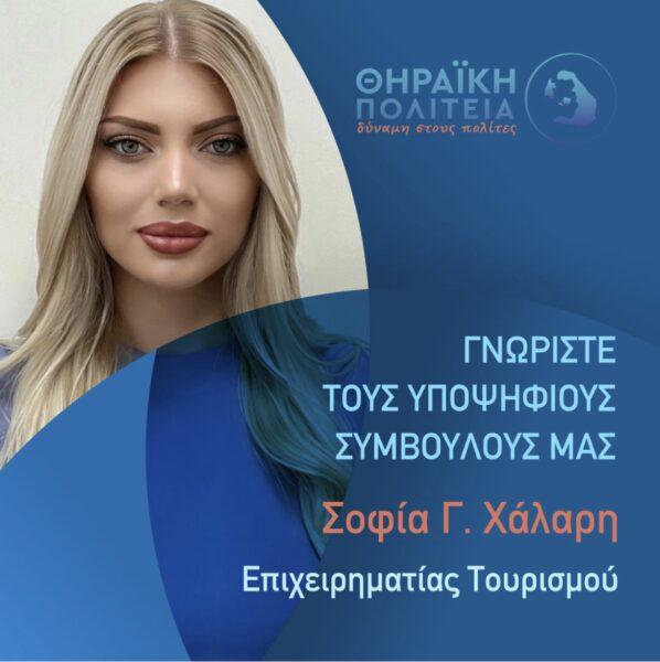 Με σπουδές στην διοίκηση επιχειρήσεων, στις βιοϊατρικές επιστήμες, το κλασικό τραγούδι, το πιάνο και με μεγάλη αγάπη για τον εθελοντισμό, η Σοφία Χάλαρη αποφάσισε να ασχοληθεί με την πολιτική όπως μας είπε γιατί θεωρεί πως «ο τόπος μας έχει ανάγκη από νέα άτομα».