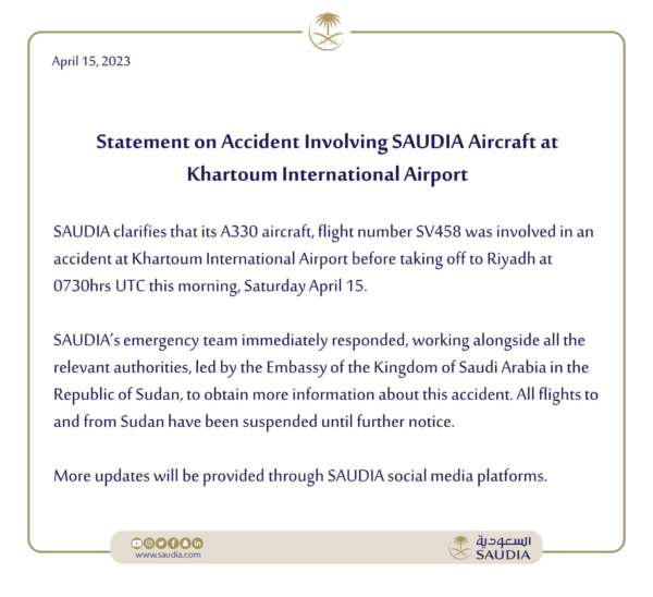 Ατύχημα είχε ένα από τα αεροσκάφη της κρατικής αεροπορικής εταιρίας της Σαουδικής Αραβίας (Saudia) στο αεροδρόμιο του Χαρτούμ στο Σουδάν πριν από την αναχώρησή του για το Ριάντ όπως ανακοίνωσε η ίδια η εταιρία χωρίς όμως να κάνει γνωστές λεπτομέρειες.