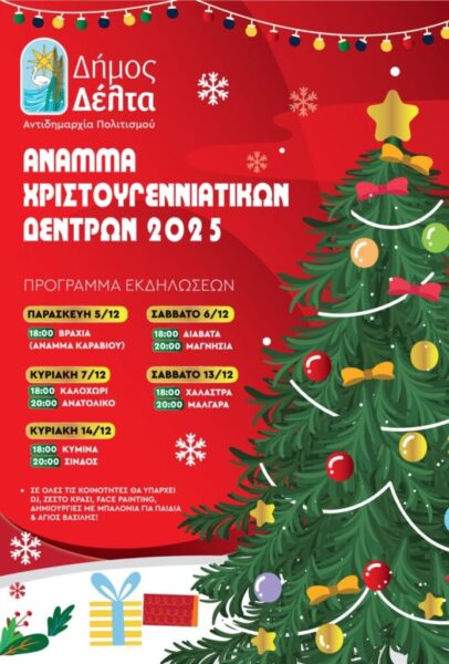 Σε γιορτινό κλίμα μπαίνει ο Δήμος Δέλτα, καθώς από αυτή την εβδομάδα ξεκινά το άναμμα των χριστουγεννιάτικων δέντρων σε όλες τις δημοτικές κοινότητες.