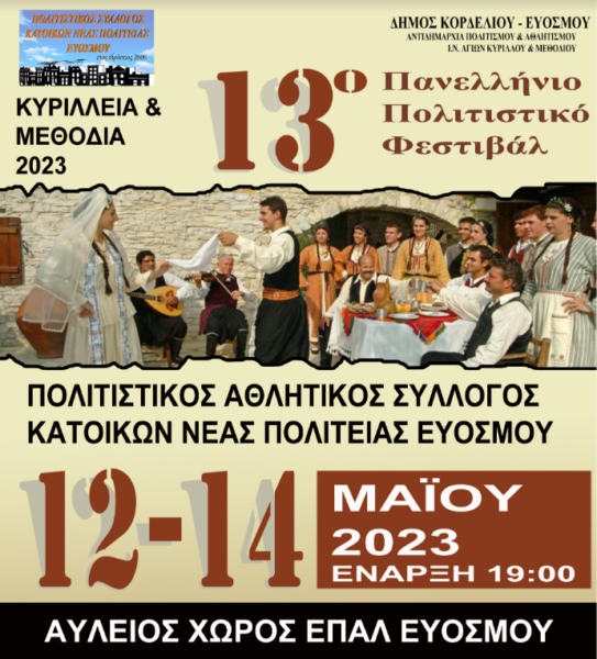 Την Παρασκευή 12 το Σάββατο 13 και την Κυριακή 14 Μαΐου 2023, ο Πολιτιστικός Σύλλογος Κατοίκων Νέας Πολιτείας Ευόσμου Θεσσαλονίκης, σε συνεργασία με τον Δήμο Κορδελιού-Ευόσμου διοργανώνει το 13ο Πανελλήνιο Πολιτιστικό Φεστιβάλ «ΚΥΡΙΛΛΕΙΑ & ΜΕΘΟΔΙΑ» 2023 Ελληνικών χορών με στόχο ένα ξεχωριστό και μοναδικό «ταξίδι» στην πολιτιστική μας παράδοση αλλά και στη σύγχρονη καλλιτεχνική δημιουργία..