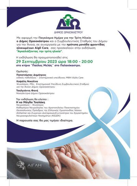 Ο Δήμος Ωραιοκάστρου και ο Συμβουλευτικός Σταθμός για την Άνοια του Δήμου, σε συνεργασία με την πρότυπη μονάδα φροντίδας ηλικιωμένων «Aigli Care», διοργανώνουν την εκδήλωση με τίτλο: «Αγκαλιάζοντας την τρίτη ηλικία», με αφορμή την Παγκόσμια Ημέρα Τρίτης Ηλικίας.