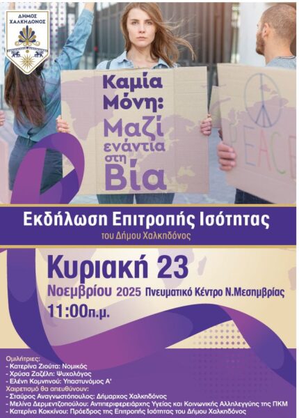 Ο Δήμος Χαλκηδόνος καλεί όλους τους πολίτες να συμμετάσχουν και να στηρίξουν την κοινή προσπάθεια για μια κοινωνία χωρίς βία, με σεβασμό, ισότητα και ασφάλεια για όλες και όλους.