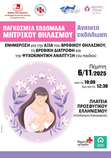 Με αφορμή τον εορτασμό της Παγκόσμιας Εβδομάδας Μητρικού Θηλασμού, ο Δήμος Καλαμαριάς, σε συνεργασία με την 4η Υγειονομική Περιφέρεια Μακεδονίας–Θράκης και το Κέντρο Υγείας 25ης Μαρτίου διοργανώνει ανοιχτή ενημερωτική εκδήλωση την Πέμπτη 6 Νοεμβρίου 2025, από τις 10:00 έως 12:30, στην Πλατεία Προσφυγικού Ελληνισμού.