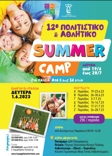 Το πρόγραμμα Καλοκαιρινής Απασχόλησης «Summer Camp 2023» που διοργανώνεται από την Κοινωφελή Επιχείρηση Πολιτισμού, Αθλητισμού και Περιβάλλοντος (ΚΕΠΑΠ) ανοίγει για ακόμη ένα καλοκαίρι την αγκαλιά του στους μικρούς δημότες μας! Ο Δήμος Πυλαίας-Χορτιάτη υλοποιεί και φέτος το «12ο αθλητικό και πολιτιστικό καλοκαιρινό Camp», ποικίλης δημιουργικής απασχόλησης, με σύνθημα: «Δημιουργούμε, μαθαίνουμε, διασκεδάζουμε, κάνουμε φίλους»