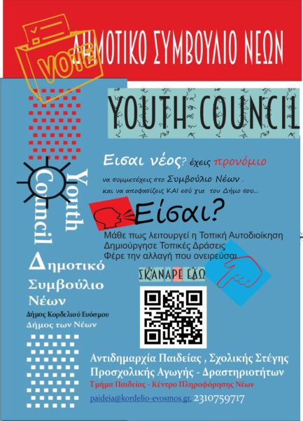 Με το σύνθημα «Γίνε μέλος του Συμβουλίου Νέων του Δήμου μας – Αποφάσισε για όλα αυτά που θα γίνουν για σένα, με εσένα μπροστά!», ο Δήμος Κορδελιού – Ευόσμου δια της Αντιδημαρχίας Παιδείας, Σχολικής Στέγης, Προσχολικής Αγωγής & Δραστηριοτήτων ανακοινώνει την έναρξη των εγγραφών στο Μητρώο Νέων, το οποίο αποτελεί το πρώτο βήμα ενόψει της συγκρότησης του νέου θεσμού, του Συμβουλίου Νέων.