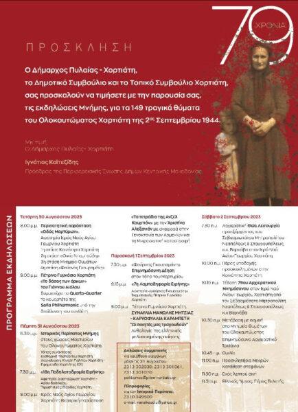 Οι εκδηλώσεις θα κορυφωθούν το Σάββατο 2 Σεπτεμβρίου με την Αρχιερατική Θεία Λειτουργία στον Ιερό Ναό του Αγίου Γεωργίου και το 79ο Αρχιερατικό Μνημόσυνο στο Μνημείο των Θυμάτων από τον Σεβασμιότατο Μητροπολίτη Νεαπόλεως και Σταυρουπόλεως κ.κ. Βαρνάβα. Θα ακολουθήσουν ομιλίες, κατάθεση στεφάνων, προσκλητήριο νεκρών, ενός λεπτού σιγή και η ανάκρουση του Εθνικού μας Ύμνου.