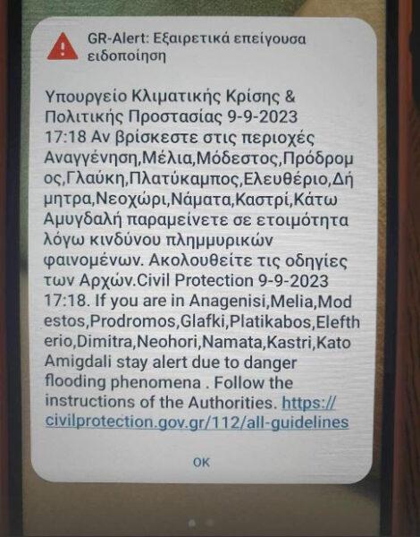 Λίγα λεπτά αργότερα εστάλη μήνυμα 112 και στις περιοχές Μεσάγκαλα και Στόμιο, αλλά και σε Αναγέννηση, Μέλια, Μόδεστο, Πρόδρομο, Γλαύκη, Πλατύκαμπο, Ελευθέριο, Δήμητρα, Νεοχώρι, Νάματα, Καστρί, Κάτω Αμυγδαλή.