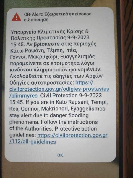 Μήνυμα 112 έλαβαν οι κάτοικοι στις περιοχές: Κάτω Ραψάνη, Ιτέα, Τέμπη, Βόννη, Μακρυχώρι, Ευαγγελισμός, Μεσάγκαλα, Στόμιο, Αναγέννηση, Μέλια, Μόδεστο, Πρόδρομος, Γλαύκη, Πλατύκαμπος, Ελευθέριο, Δήμητρα, Νεοχώρι, Νάματα, Καστρί, και Κάτω Αμυγδαλή.