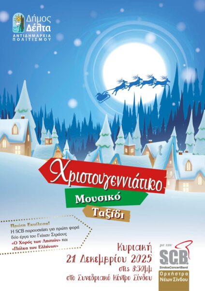 Ο Δήμος Δέλτα και η Αντιδημαρχία Πολιτισμού προσκαλούν τους δημότες και τους φίλους της μουσικής σε ένα ξεχωριστό «Χριστουγεννιάτικο μουσικό ταξίδι», με τη συμμετοχή της Ορχήστρας Νέων Σίνδου Δήμου Δέλτα.